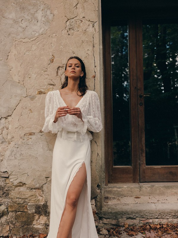 Zarte Spitze, feiner Tüll, Seidenkrepp oder Satin. Von transparent bis vollständig blickdicht. Es gibt Varianten mit Manschette und Knopfleiste, Illusion-Ärmeln oder dezentem Volumen am Handgelenk.