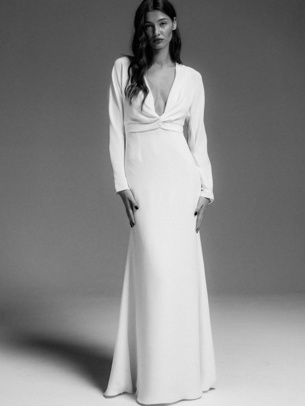 Lange Ärmel geben Ruhe und Rahmen. Sie eignen sich für kühlere Jahreszeiten, kirchliche Hochzeiten und abendliche Feiern. Die Silhouette bleibt geschlossen, der Fokus liegt auf Schnitt und Material.