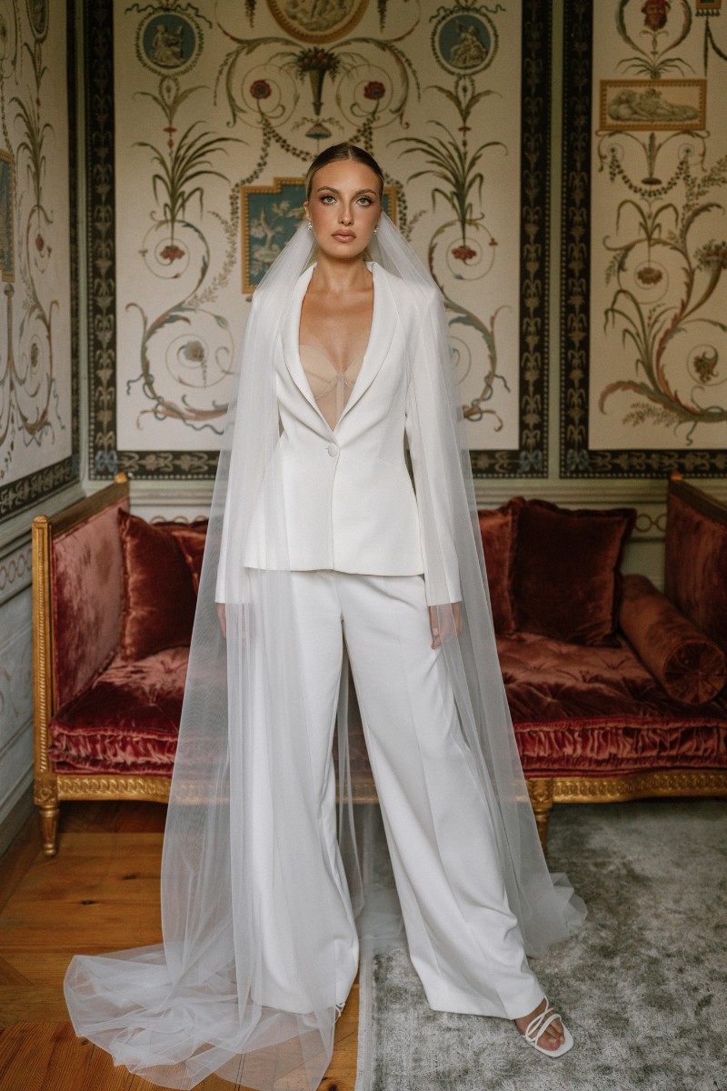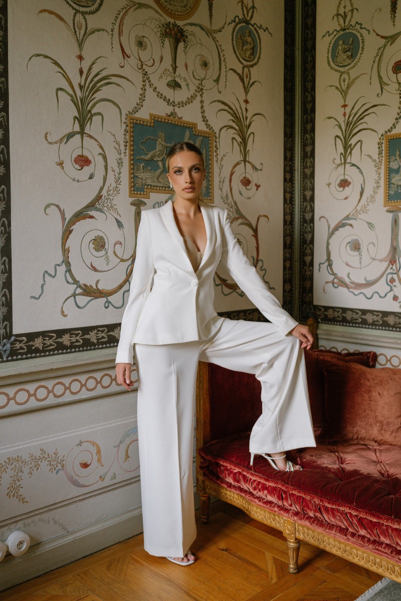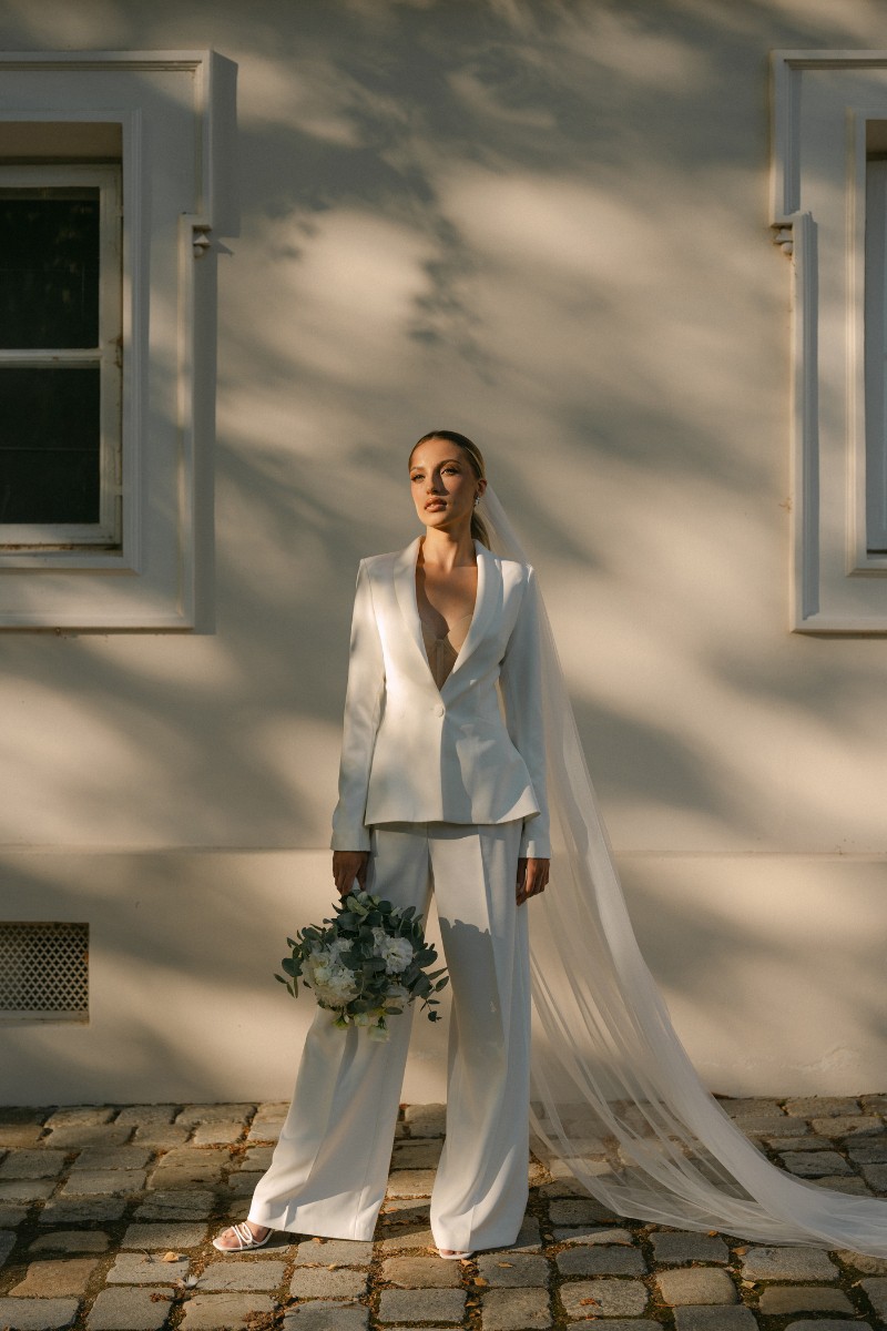 Ein Hosenanzug für die Braut ist geradlinig, feminin und zugleich kraftvoll. Er bringt Struktur in die Brautmode – klar, elegant und wandelbar. Besonders in Kombination mit weich fließenden Stoffen entsteht eine moderne Silhouette mit Tiefe.