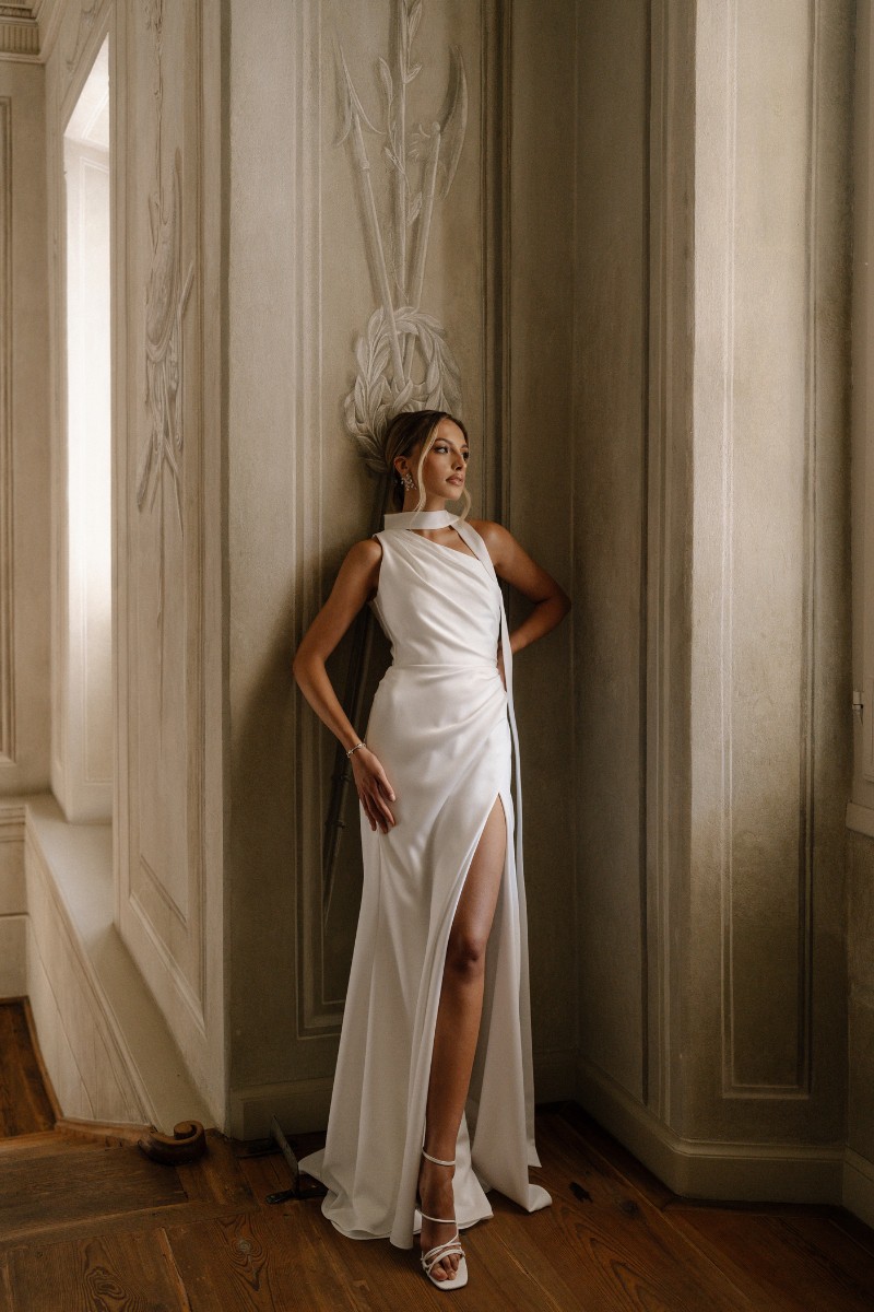 Ob One-Shoulder Brautkleid oder ein mutiger, asymmetrischer Schnitt – diese Kleider sind Statements. Nicht laut, nicht überladen, sondern präzise, feminin und klar. Sie richten sich an Bräute, die mit Mode umgehen wie mit Worten: bewusst, gezielt und mit Stil.