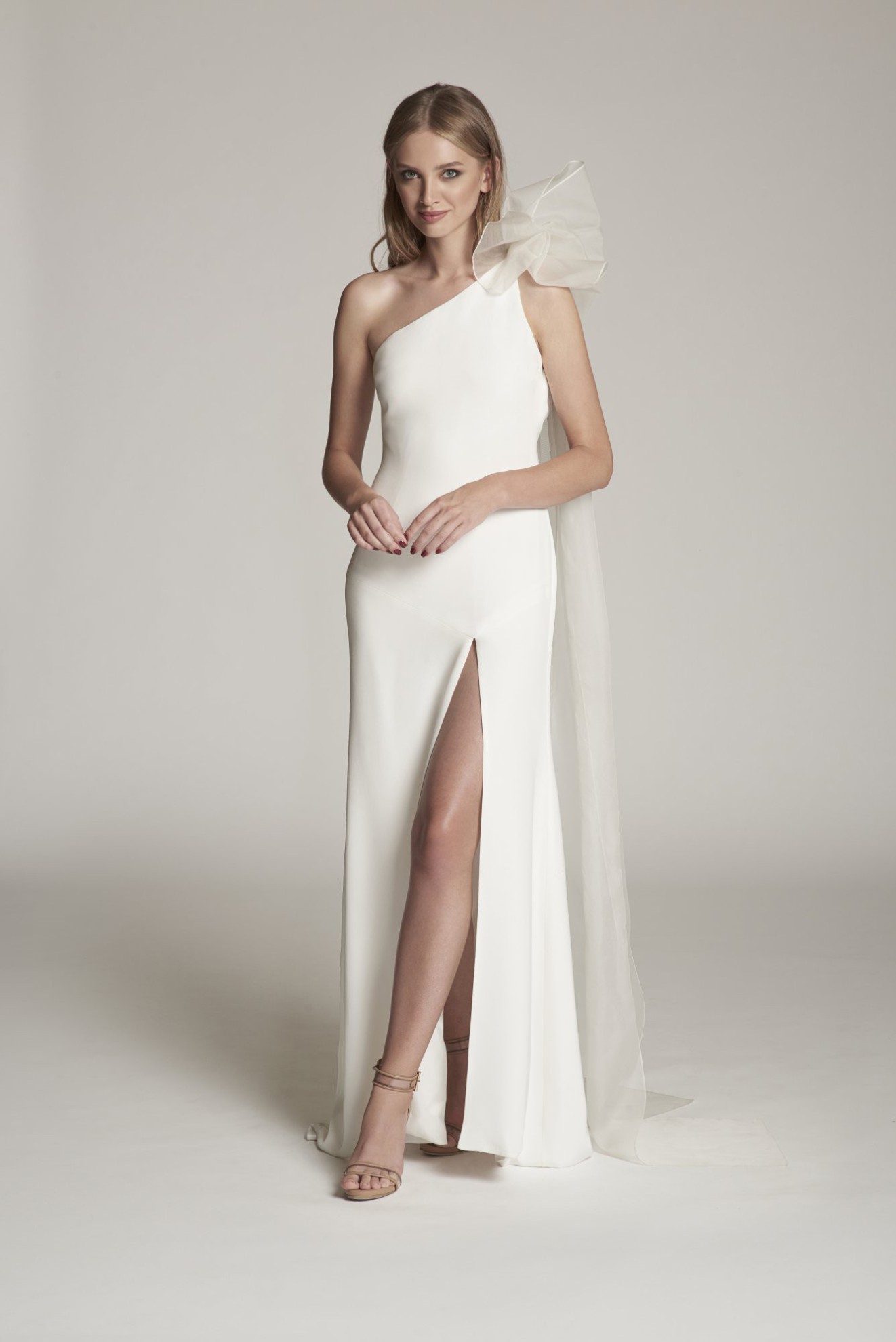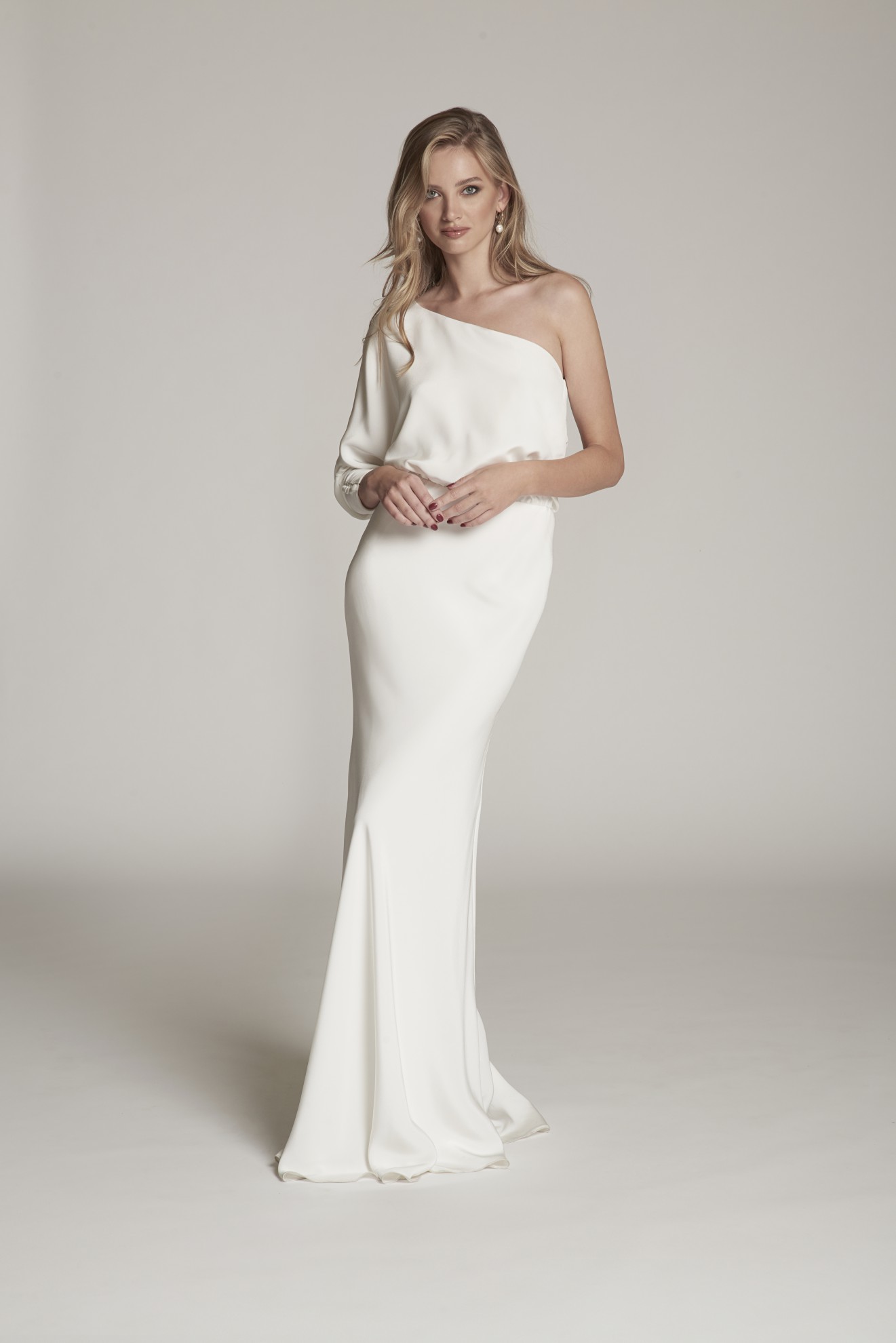 Ob in feinem Crêpe, edlem Satin oder weicher Seide: One-Shoulder Brautkleider überzeugen durch klare Linienführung und eine selbstbewusste Silhouette.
